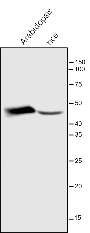 The sequence of the recombinant protein used for immunization is homologues with the sequence in Arabidopsis thaliana, rice, maize, soybean, rape, pepper, barley, etc. For more species homologues information, please contact tech support at TEL 400-880-3241 |
