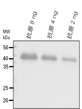 上样:梯度稀释的抗原蛋白 电泳:12% SDS-PAGE 转膜:NC (nitrocellulose) 膜,电压10v过夜 封闭:5% 脱脂奶粉,室温孵育1h 一抗: 1:5000 稀释,室温孵育1h |