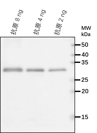 上样:梯度稀释的抗原蛋白 电泳:12% SDS-PAGE 转膜:NC (nitrocellulose) 膜,电压10v过夜 封闭:5% 脱脂奶粉,室温孵育1h 一抗: 1:5000 稀释,室温孵育1h |